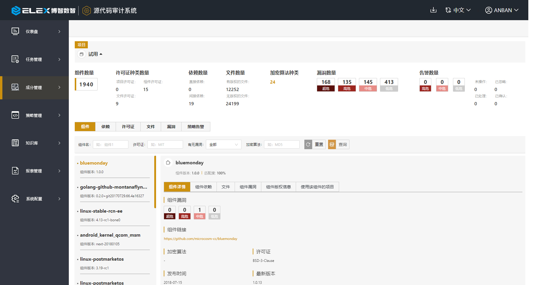 博智源代码审计系统基于多年的开源软件、开源合规和漏洞的数据积累,通过多种行业领先的算法打造出安全、合规、高效、易用的软件成分分析系统,为企业梳理研发过程中的软件物料清单,解决研发开源治理过程中的安全和合规问题。