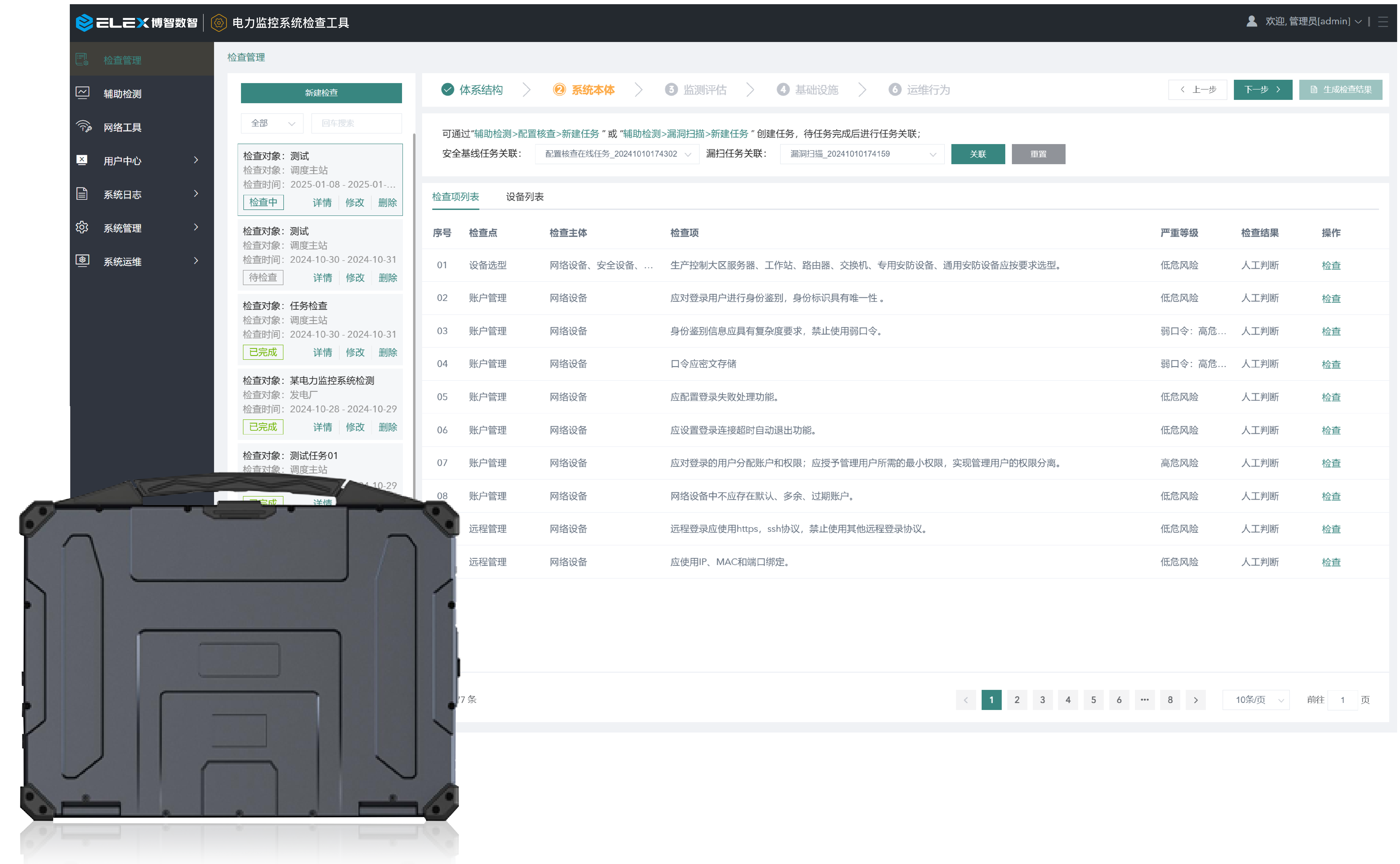 博智电力监控系统检查工具依据《电力监控系统安全防护规定》等相关标准法规和要求,针对电力系统生产线提供专业的检查知识和检查方法,遵循体系结构-系统本体-监测评估-基础设施-管理制度-运维行为检查流程,对采集的资产信息、漏洞信息、高危端口和配置核查等数据进行对比、自动化关联,结合人工检查结果,输出电力监控系统安全防护整改通知书和电力监控系统安全防护技术监督报告,从而促进电力监控系统安全执法检查和企业自查工作的常态化、标准化,以及规范化。