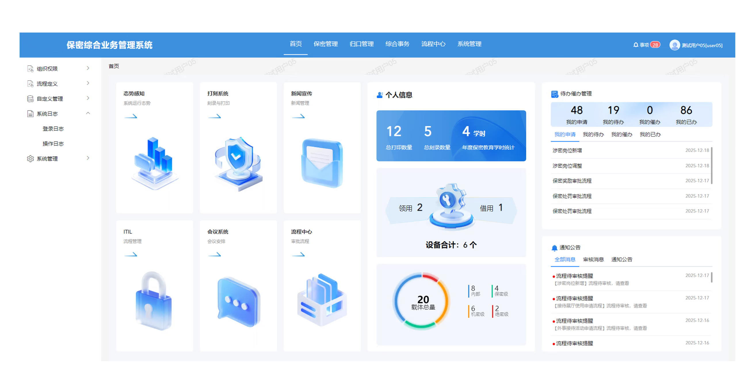 博智保密信息全域管理系统面向保密管理工作中的定密管理、涉密人员管理、涉密网管理三大管理以及包括保密制度、保密责任、涉密载体管理、涉密信息系统管理、涉密会议活动管理、涉密信息设备管理、涉密项目管理等多类保密管理对象,提供多维度、全景式、智能化、全生命周期的保密信息管理功能。为单位提供一个符合保密要求的流程制度合规化和资产数据规范化的保密信息全域管理系统,实现“横向全覆盖,纵向通数据”的能力,确保保密管理无死角。