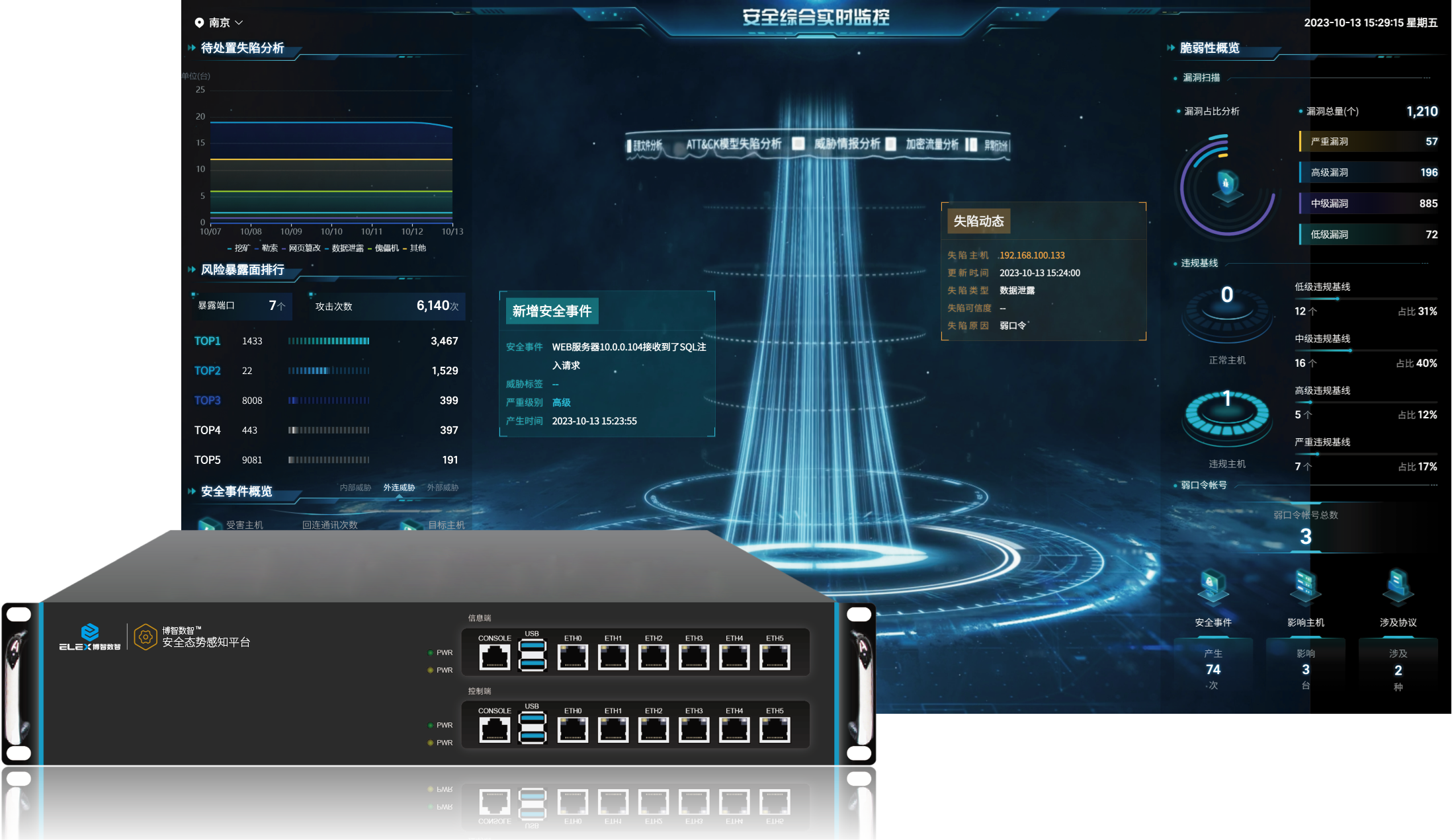 博智安全态势感知平台统一采集各类结构化和非结构化的数据,包括各类设备、应用日志以及网络流量和各种脆弱性,通过平台内置的标准风险模型,从实时分析、离线分析、关联 分析、统计分析、规则库、专家经验库以及外部安全情报的交换、机器学习等多方位进行风险分析。